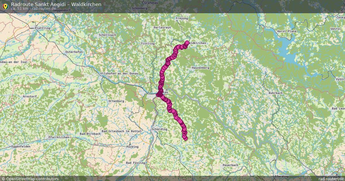 Die Fahrradroute von Sankt Aegidi nach Waldkirchen ist ca. 51 km lang und führt über Engelhartszell an der Donau. Wichtige Straßen auf der Strecke: Jochensteiner Straße, Grüß-Gott-Weg, Haugstein Bezirksstraße und Schröckstraße.
