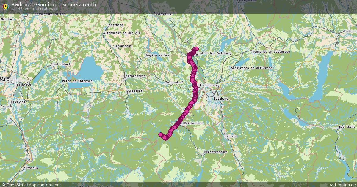 Die Fahrradroute von Göming nach Schneizlreuth ist ca. 47 km lang und führt über Salzburg. Wichtige Straßen auf der Strecke: Kiblinger Weg und Salzburger Straße.
