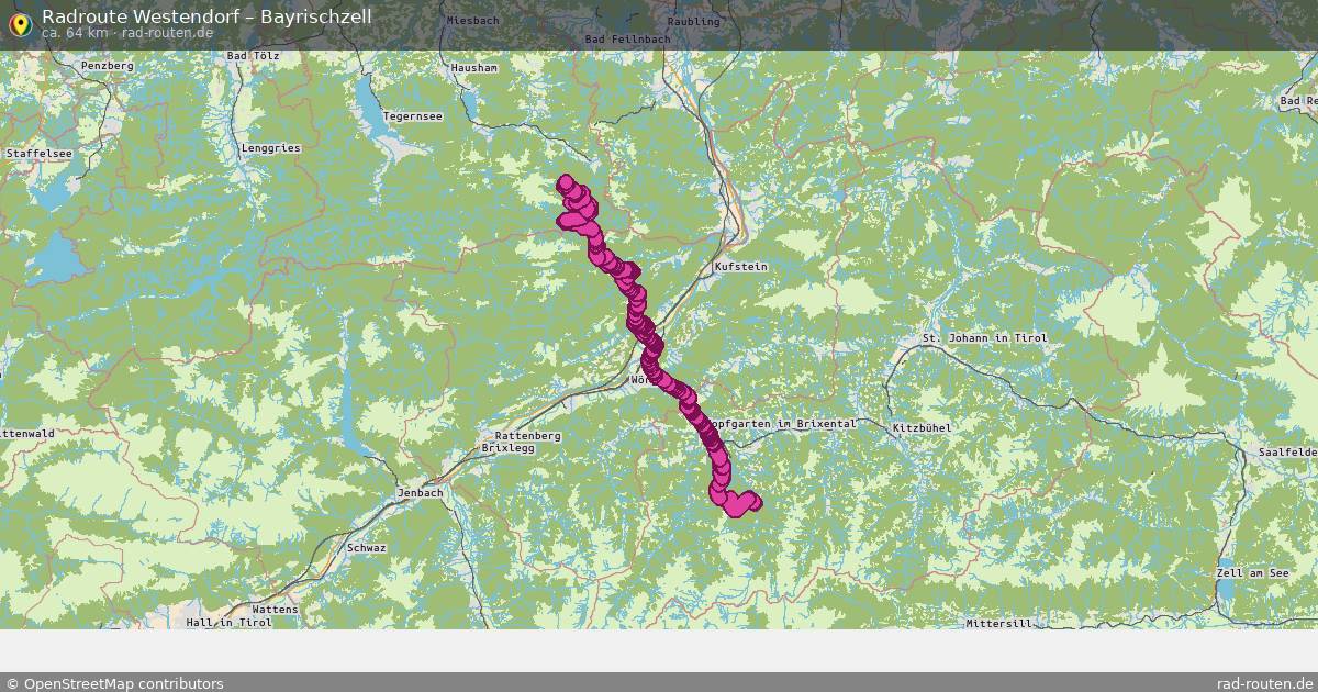 Die Fahrradroute von Westendorf nach Bayrischzell ist ca. 64 km lang und führt über Bezirk Kitzbühel, Itter, Wörgl und Kirchbichl. Wichtige Straßen auf der Strecke: Unterwindau, Hinterer Sonnbergweg, Tiroler Straße, Inntalradweg und Mitterland.