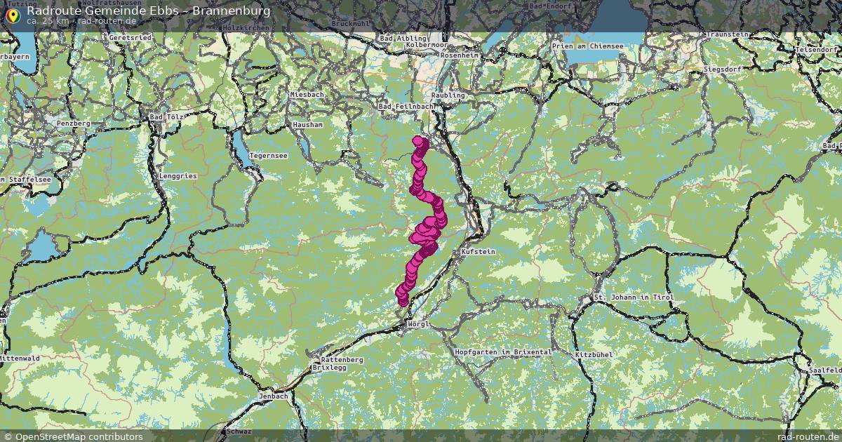 Die Fahrradroute von Gemeinde Ebbs nach Brannenburg ist ca. 25 km lang und führt über Bezirk Kufstein, Gemeinde Erl, Nußdorf am Inn und Flintsbach am Inn.