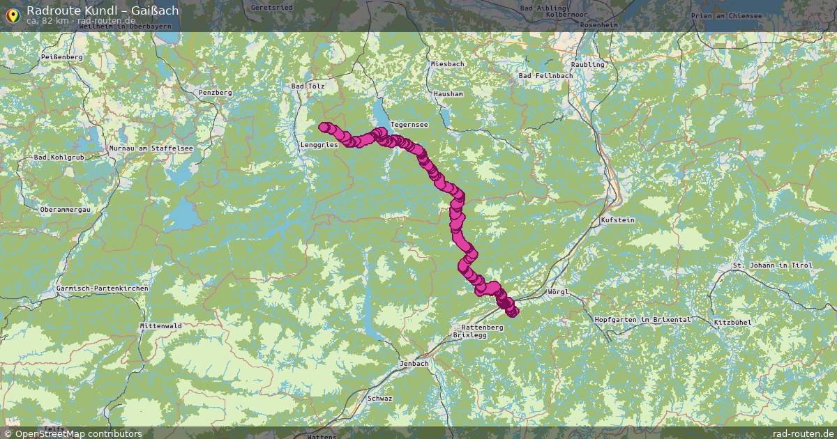 Die Fahrradroute von Kundl nach Gaißach ist ca. 82 km lang und führt über Breitenbach am Inn, Brandenberg, Steinberg am Rofan und Achenkirch. Wichtige Straßen auf der Strecke: Alter Steinbergweg und Brandenberg.
