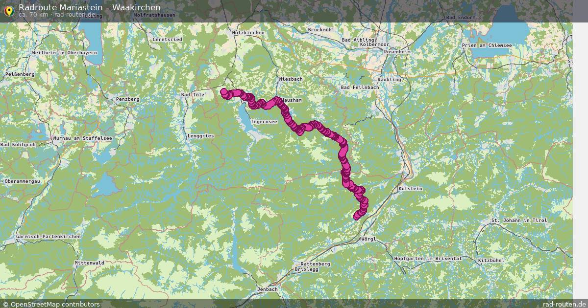 Die Fahrradroute von Mariastein nach Waakirchen ist ca. 70 km lang und führt über Langkampfen und Thiersee. Wichtige Straßen auf der Strecke: Tiroler Straße, Gschwender Straße, Hinterer Sonnbergweg, Schlierachstraße und Glemmtal.