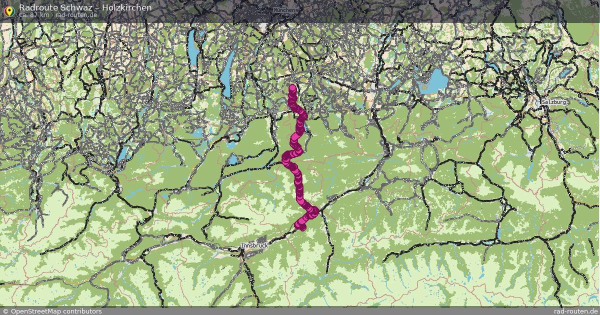 Die Fahrradroute von Schwaz nach Holzkirchen ist ca. 87 km lang und führt über Gallzein, Buch in Tirol, Jenbach und Wiesing. Wichtige Straßen auf der Strecke: Alte Seeuferstraße, Gallzein, Seestraße, Breitenbachtal und Ried.