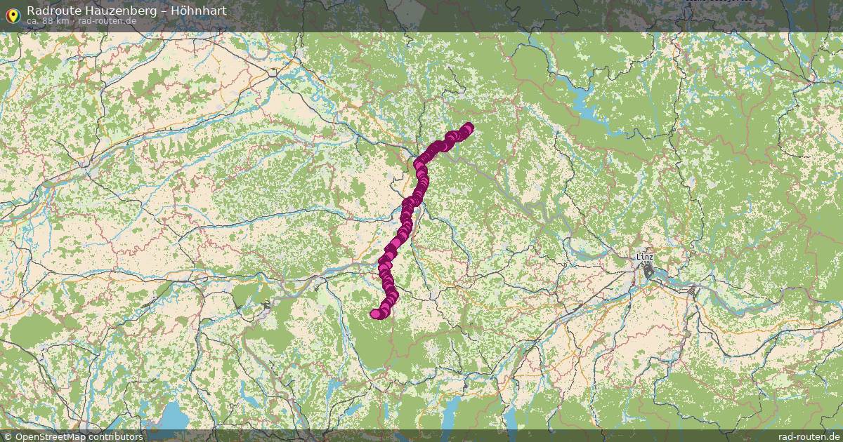 Die Fahrradroute von Hauzenberg nach Höhnhart ist ca. 88 km lang und führt über Schardenberg, Wernstein am Inn, Bezirk Schärding und St. Marienkirchen bei Schärding. Wichtige Straßen auf der Strecke: Innradweg, Kneippstraße und Bachwanderweg.