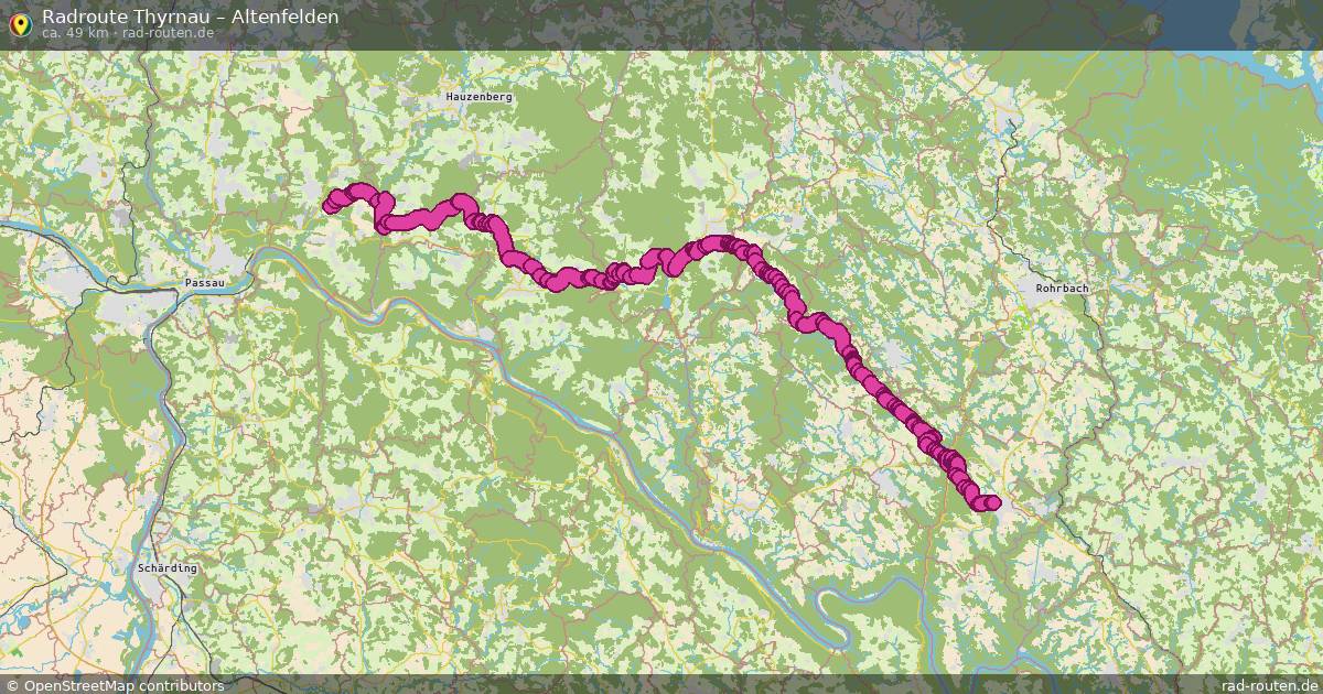 Die Fahrradroute von Thyrnau nach Altenfelden ist ca. 49 km lang und führt über Neustift im Mühlkreis, Oberkappel, Pfarrkirchen im Mühlkreis und Putzleinsdorf. Wichtige Straßen auf der Strecke: Bachwanderweg und Alte Straße.