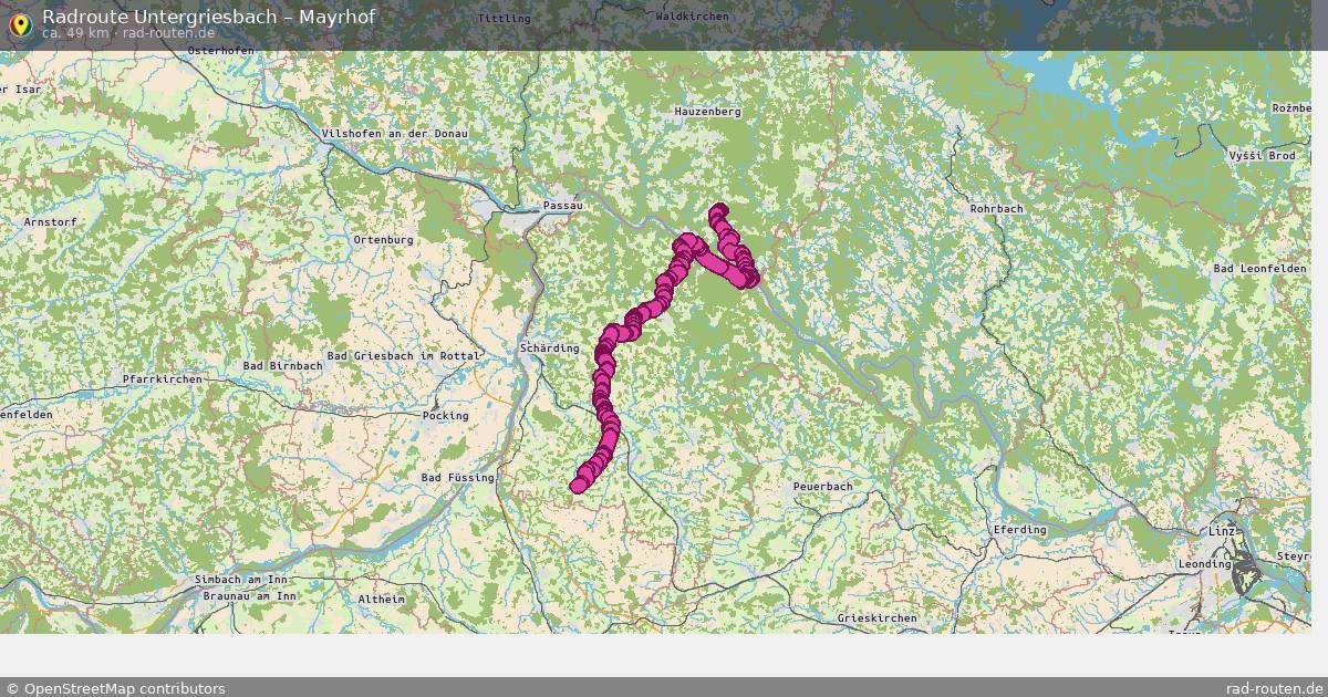 Die Fahrradroute von Untergriesbach nach Mayrhof ist ca. 49 km lang und führt über Engelhartszell an der Donau, Sankt Aegidi, Sankt Roman und Kopfing im Innkreis. Wichtige Straße auf der Strecke: Jochensteiner Straße.