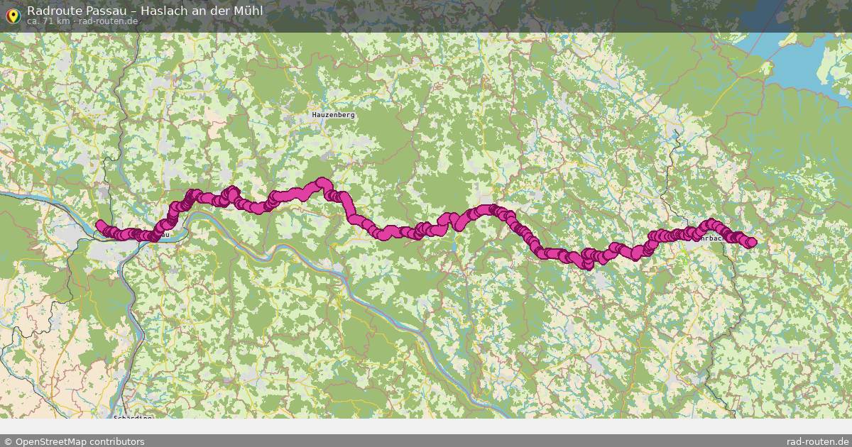 Die Fahrradroute von Passau nach Haslach an der Mühl ist ca. 71 km lang und führt über Kollerschlag, Peilstein im Mühlviertel, Oepping und Rohrbach-Berg. Wichtige Straße auf der Strecke: Mistlberg.