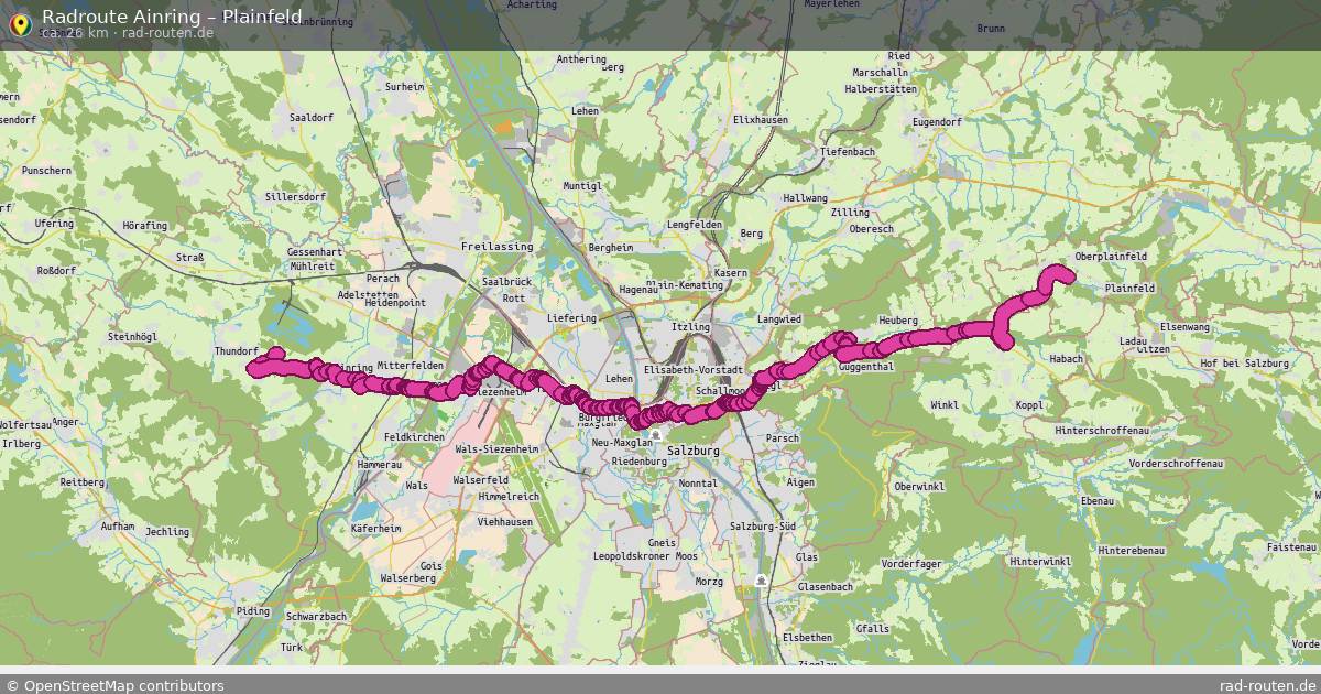 Die Fahrradroute von Ainring nach Plainfeld ist ca. 26 km lang und führt über Siezenheim, Wals-Siezenheim, Taxham und Maxglan. Wichtige Straßen auf der Strecke: Plainfelder Landesstraße und Siezenheimer Straße.