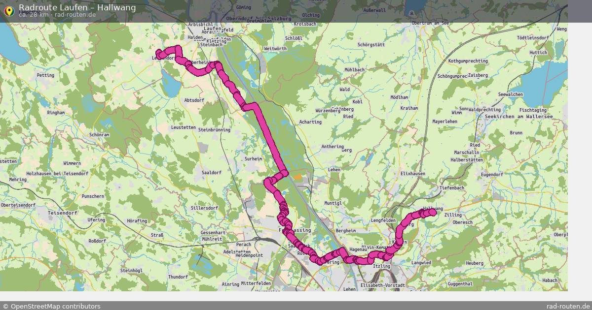 Die Fahrradroute von Laufen nach Hallwang ist ca. 28 km lang und führt über Liefering, Itzling und Langwied. Wichtige Straße auf der Strecke: Ischlerbahntrasse.
