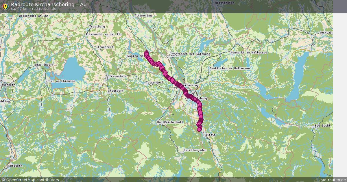 Die Fahrradroute von Kirchanschöring nach Au ist ca. 47 km lang und führt über Oberbayern, Liefering, Lehen und Mülln. Wichtige Straßen auf der Strecke: Esinger Straße, Treppelweg, Tauernradweg und Abtsee.