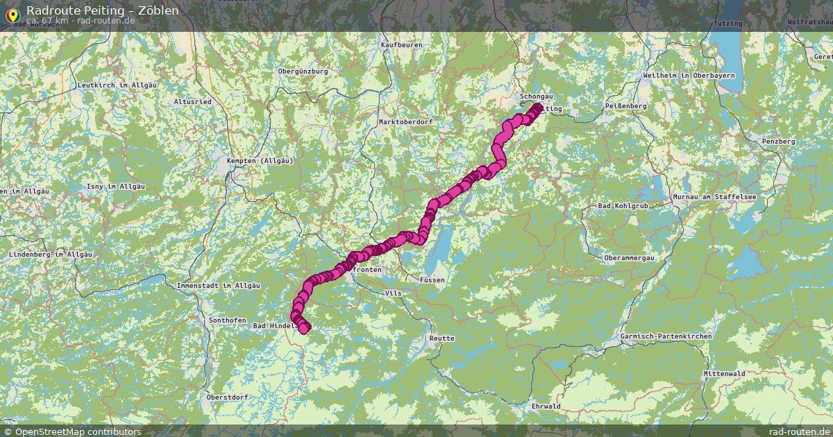 Die Fahrradroute von Peiting nach Zöblen ist ca. 67 km lang und führt über Steingaden (VGem) und Bayern. Wichtige Straßen auf der Strecke: Romantische Straße, Kreuther Weg, Vilstalstraße, Via Claudia und Edelsbergweg.