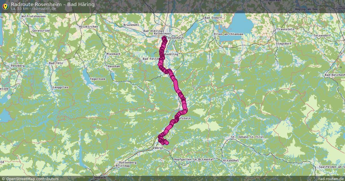 Die Fahrradroute von Rosenheim nach Bad Häring ist ca. 53 km lang und führt über Rohrdorf, Raubling, Brannenburg und Flintsbach am Inn. Wichtige Straße auf der Strecke: Auweg.