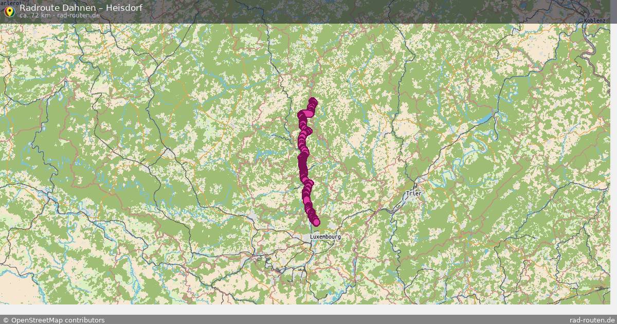 Die Fahrradroute von Dahnen nach Heisdorf ist ca. 72 km lang und führt über Daleiden, Dasburg, Hosingen und Munshausen. Wichtige Straßen auf der Strecke: Piste cyclable de l'Alzette und Rue de la Gare.