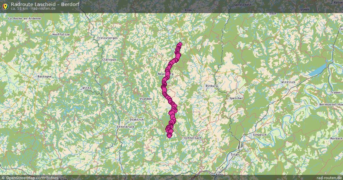 Die Fahrradroute von Lascheid nach Berdorf ist ca. 51 km lang und führt über Lambertsberg, Mauel, Oberpierscheid und Burscheid.
