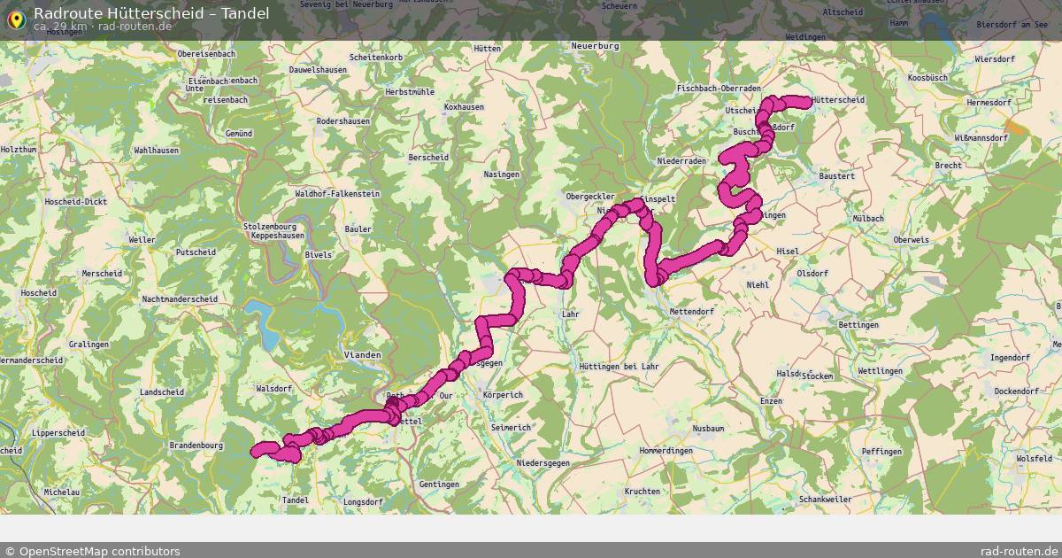 Die Fahrradroute von Hütterscheid nach Tandel ist ca. 29 km lang und führt über Südeifel. Wichtige Straße auf der Strecke: Piste cyclable "Benni".