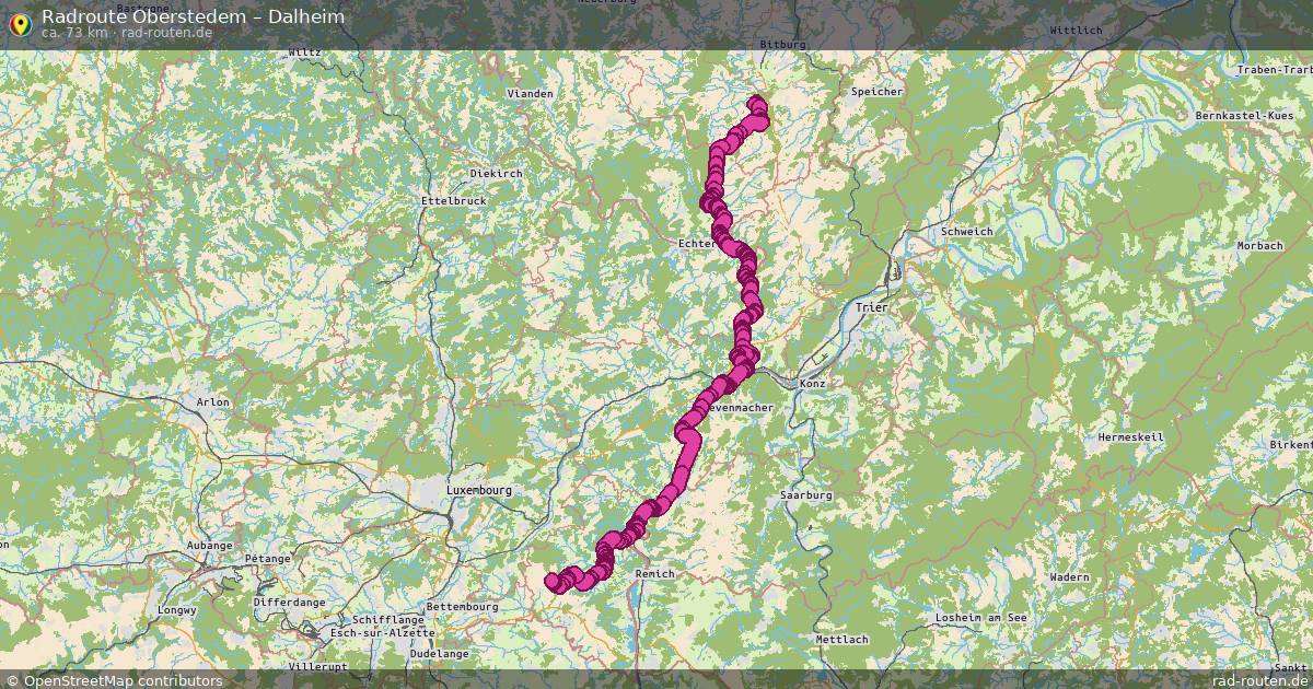 Die Fahrradroute von Oberstedem nach Dalheim ist ca. 73 km lang und führt über Südeifel, Edingen, Godendorf und Ralingen. Wichtige Straßen auf der Strecke: Route du Vin, Edinger Berg und Ancienne Route Romaine Kiem.