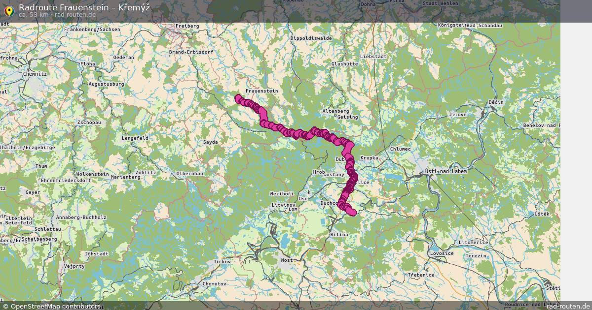 Die Fahrradroute von Frauenstein nach Křemýž ist ca. 53 km lang und führt über Klingenberg, Rechenberg-Bienenmühle und Altenberg. Wichtige Straßen auf der Strecke: Schlüsselweg, Holperbachweg, Kreuzweg und Gimmlitztal.