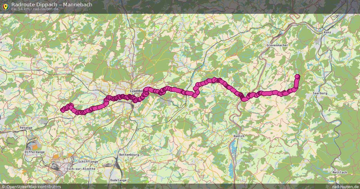Die Fahrradroute von Dippach nach Mannebach ist ca. 54 km lang und führt über Wincheringen, Söst und Fisch. Wichtige Straßen auf der Strecke: Rue des Celtes und Route des Trois Cantons.