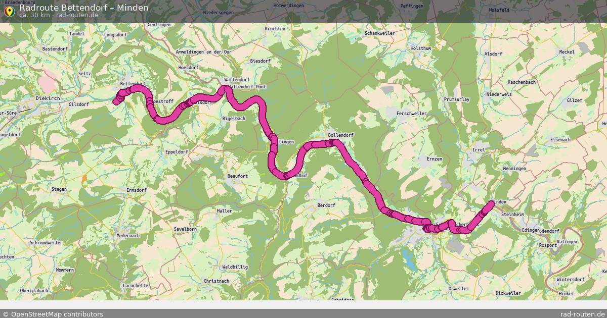 Die Fahrradroute von Bettendorf nach Minden ist ca. 30 km lang und führt über Lëtzebuerg und Südeifel. Wichtige Straße auf der Strecke: PC 3.