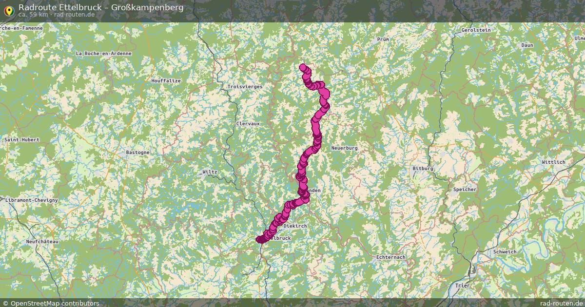 Die Fahrradroute von Ettelbruck nach Großkampenberg ist ca. 59 km lang und führt über Hoscheid, Hosingen, Consthum und Munshausen.