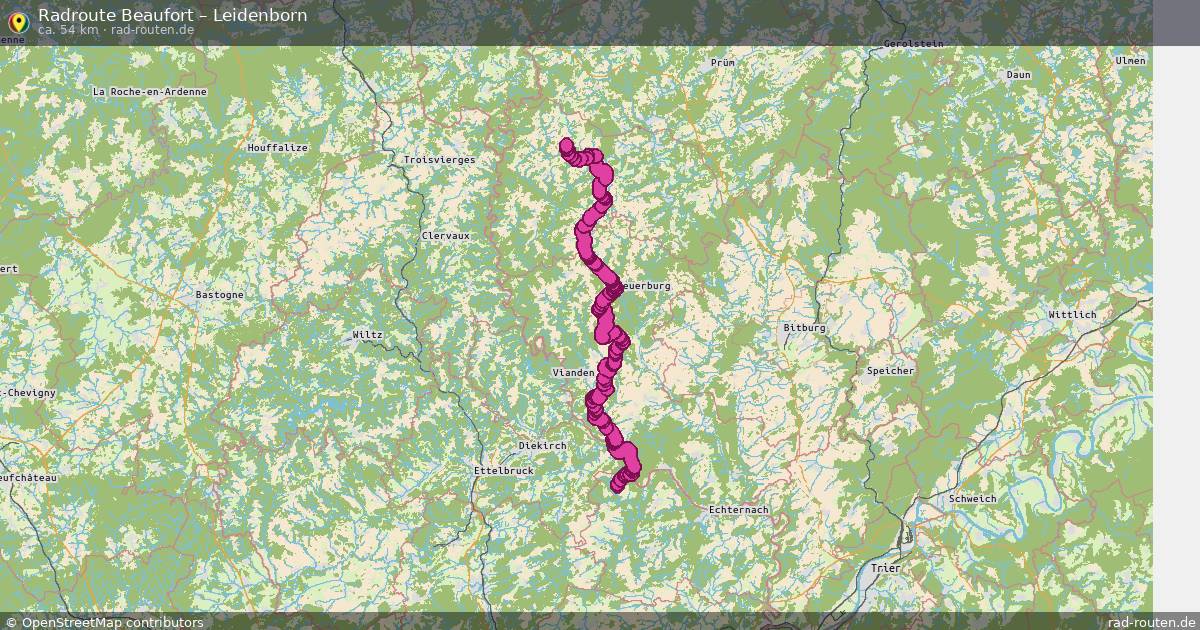 Die Fahrradroute von Beaufort nach Leidenborn ist ca. 54 km lang und führt über Condominium Lëtzebuerg-Deutschland, Südeifel, Arzfeld und Lichtenborn. Wichtige Straße auf der Strecke: Route de Beaufort.