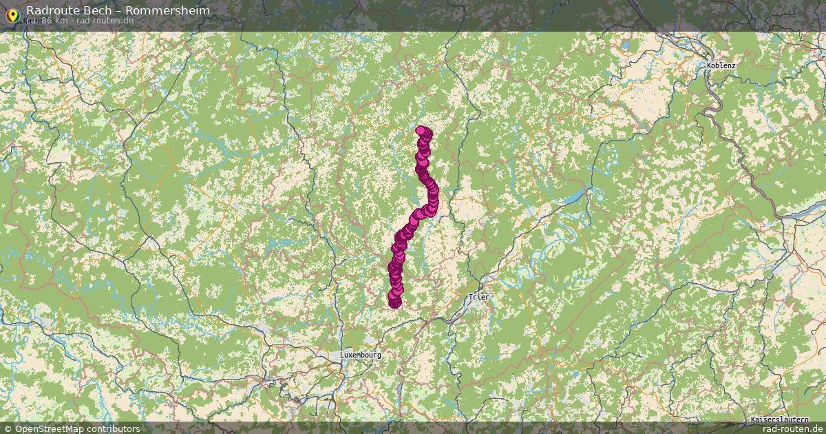 Die Fahrradroute von Bech nach Rommersheim ist ca. 86 km lang und führt über Condominium Lëtzebuerg-Deutschland, Südeifel, Bitburger Land und Feuerscheid. Wichtige Straßen auf der Strecke: Ancienne ligne Luxembourg - Echternach und Nimsradweg.