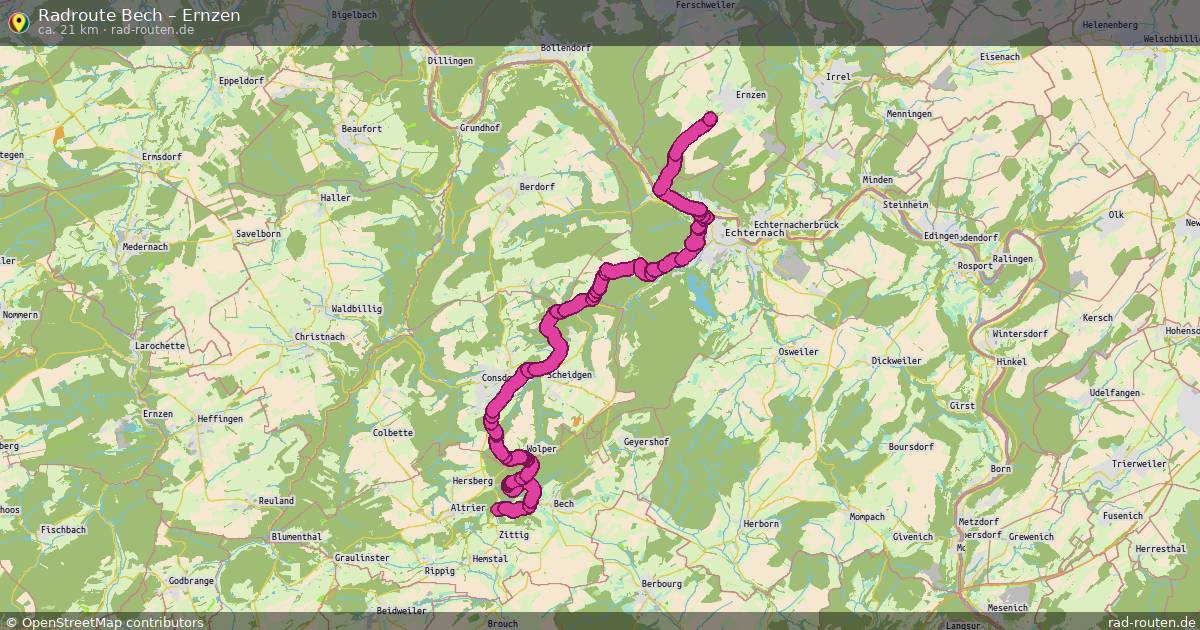 Die Fahrradroute von Bech nach Ernzen ist ca. 21 km lang und führt über Lëtzebuerg und Südeifel. Wichtige Straße auf der Strecke: Ancienne ligne Luxembourg - Echternach.