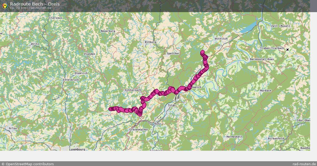 Die Fahrradroute von Bech nach Dreis ist ca. 70 km lang und führt über Metzdorf, Wintersdorf, Udelfangen und Trierweiler.