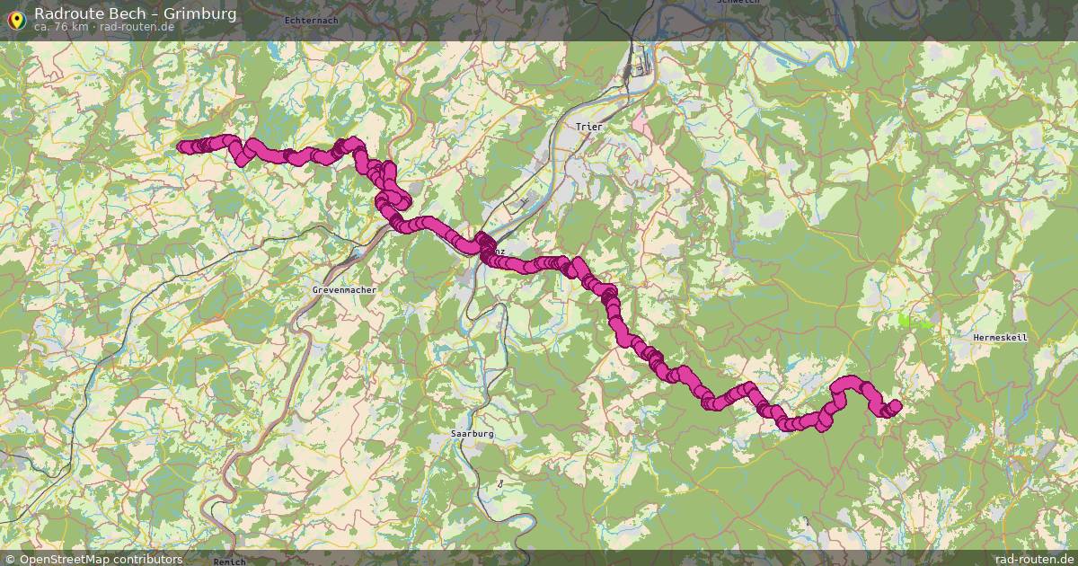 Die Fahrradroute von Bech nach Grimburg ist ca. 76 km lang und führt über Wasserbilligerbrück, Löwener Mühle, Igel und Trier. Wichtige Straßen auf der Strecke: Ruwer-Hochwald-Radweg und Falkensteinstraße.