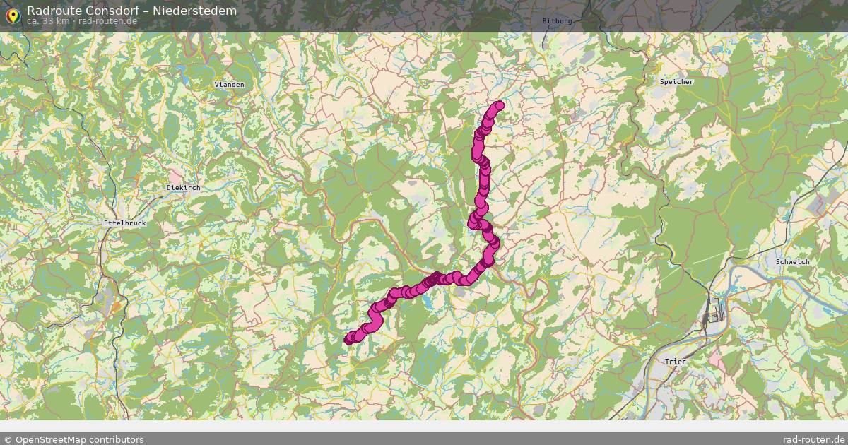 Die Fahrradroute von Consdorf nach Niederstedem ist ca. 33 km lang und führt über Südeifel.
