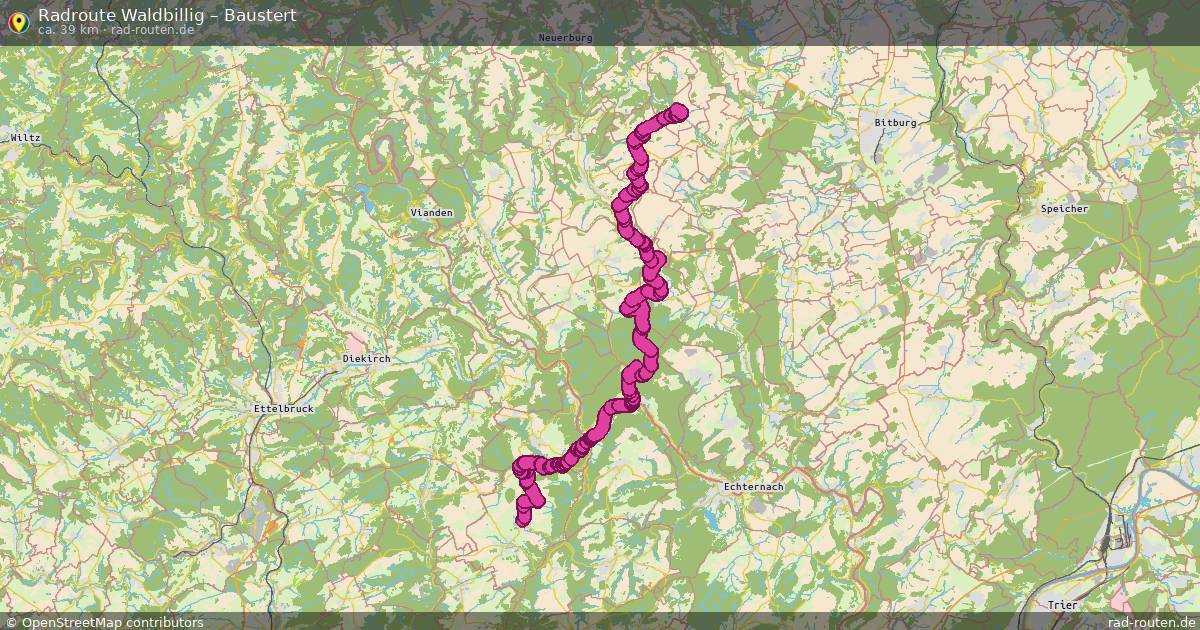 Die Fahrradroute von Waldbillig nach Baustert ist ca. 39 km lang und führt über Condominium Lëtzebuerg-Deutschland und Südeifel.