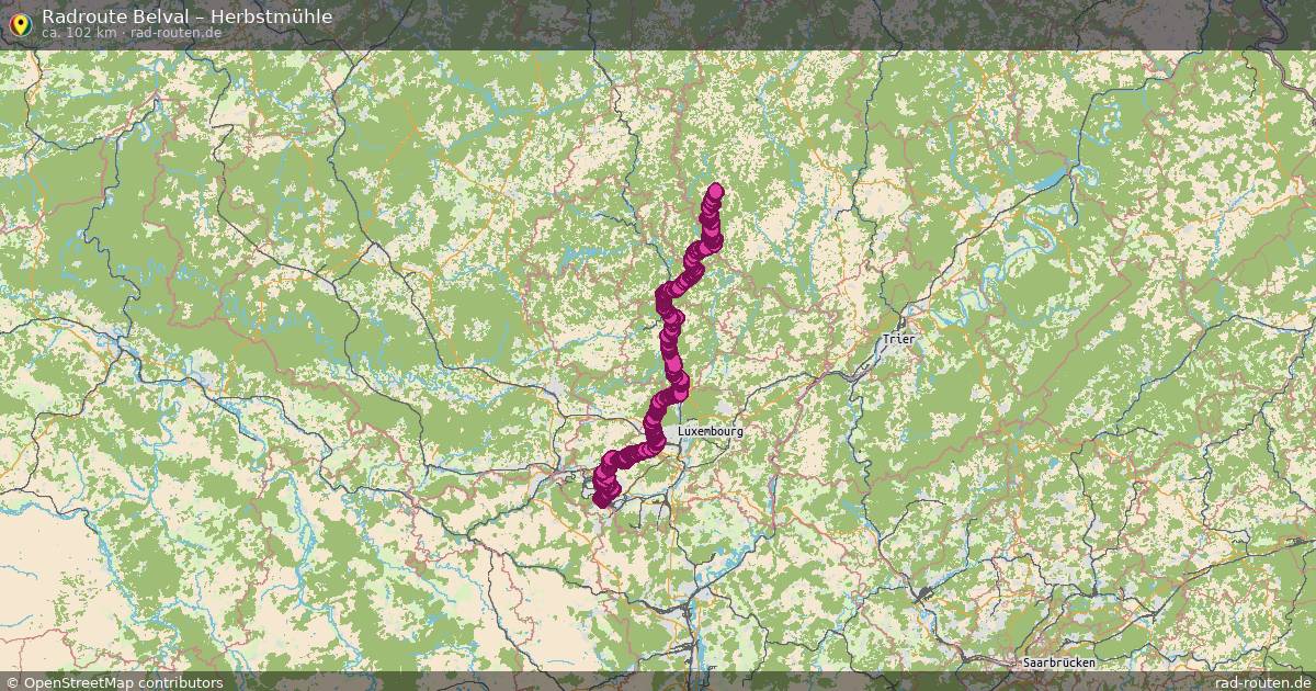 Die Fahrradroute von Belval nach Herbstmühle ist ca. 102 km lang und führt über Lëtzebuerg und Hosingen. Wichtige Straßen auf der Strecke: Piste cyclable de l'Alzette und Rue de la Gare.