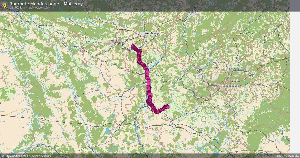 Die Fahrradroute von Mondercange nach Maizeroy ist ca. 92 km lang und führt über Thionville. Wichtige Straßen auf der Strecke: Piste cyclable des Trois Cantons und Chemin des Pèlerins.