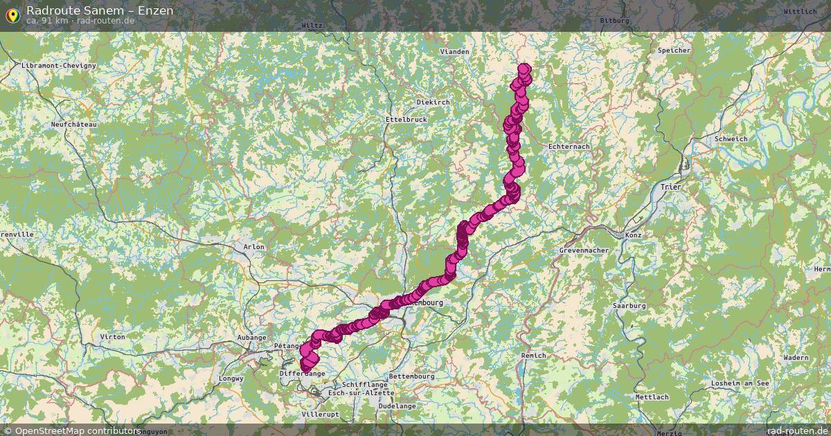 Die Fahrradroute von Sanem nach Enzen ist ca. 91 km lang und führt über Sprinkange, Schouweiler, Bettange-sur-Mess und Südeifel. Wichtige Straßen auf der Strecke: Piste cyclable de l'Alzette, Rue de la Gare und Am Roudebierg.