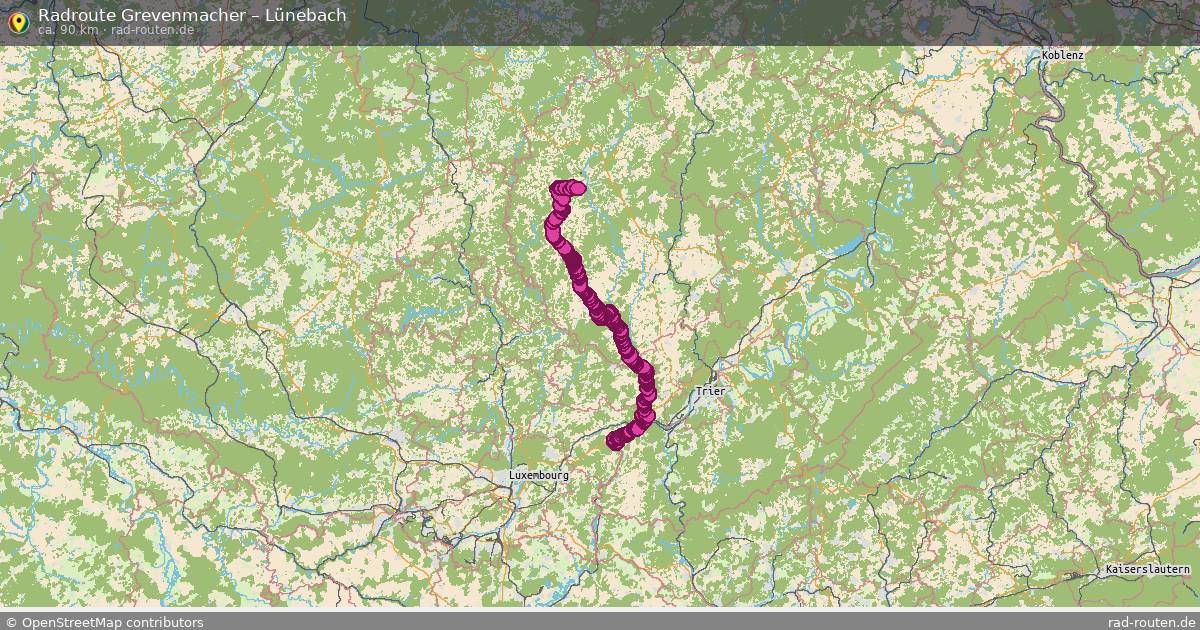Die Fahrradroute von Grevenmacher nach Lünebach ist ca. 90 km lang und führt über Metzdorf, Wintersdorf, Ralingen und Godendorf. Wichtige Straße auf der Strecke: Prümtal-Radweg.