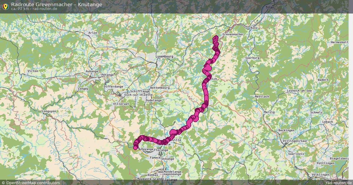 Die Fahrradroute von Grevenmacher nach Knutange ist ca. 77 km lang und führt über Wincheringen, Wehr, Palzem und Kreuzweiler. Wichtige Straßen auf der Strecke: Chemin de la Moselle und Moselradweg.