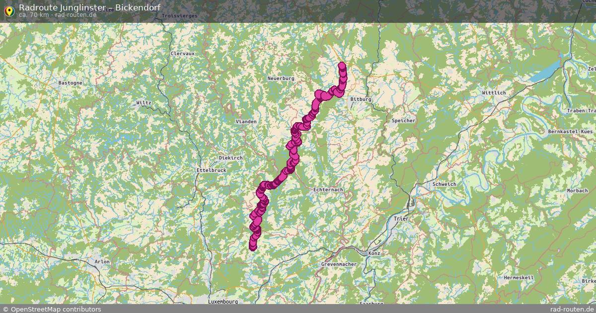 Die Fahrradroute von Junglinster nach Bickendorf ist ca. 70 km lang und führt über Condominium Lëtzebuerg-Deutschland und Südeifel. Wichtige Straßen auf der Strecke: Rue de la Station und PC2.