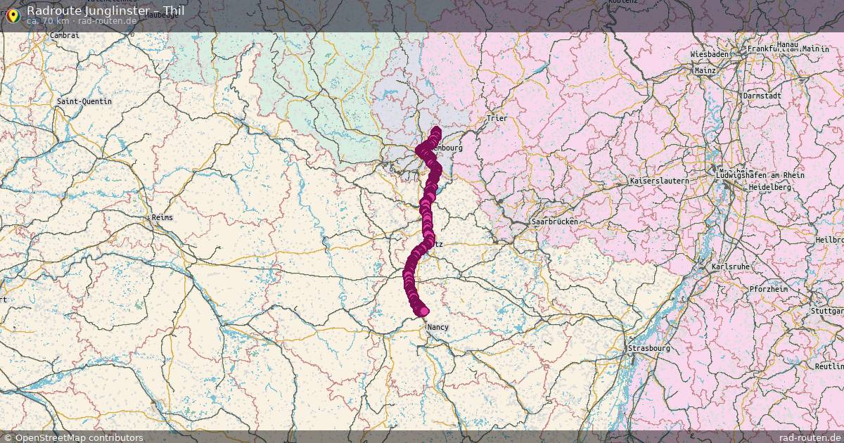 Die Fahrradroute von Junglinster nach Thil ist ca. 70 km lang und führt über Grand Est. Wichtige Straßen auf der Strecke: Piste cyclable des Trois Cantons und Piste cyclable François Faber.