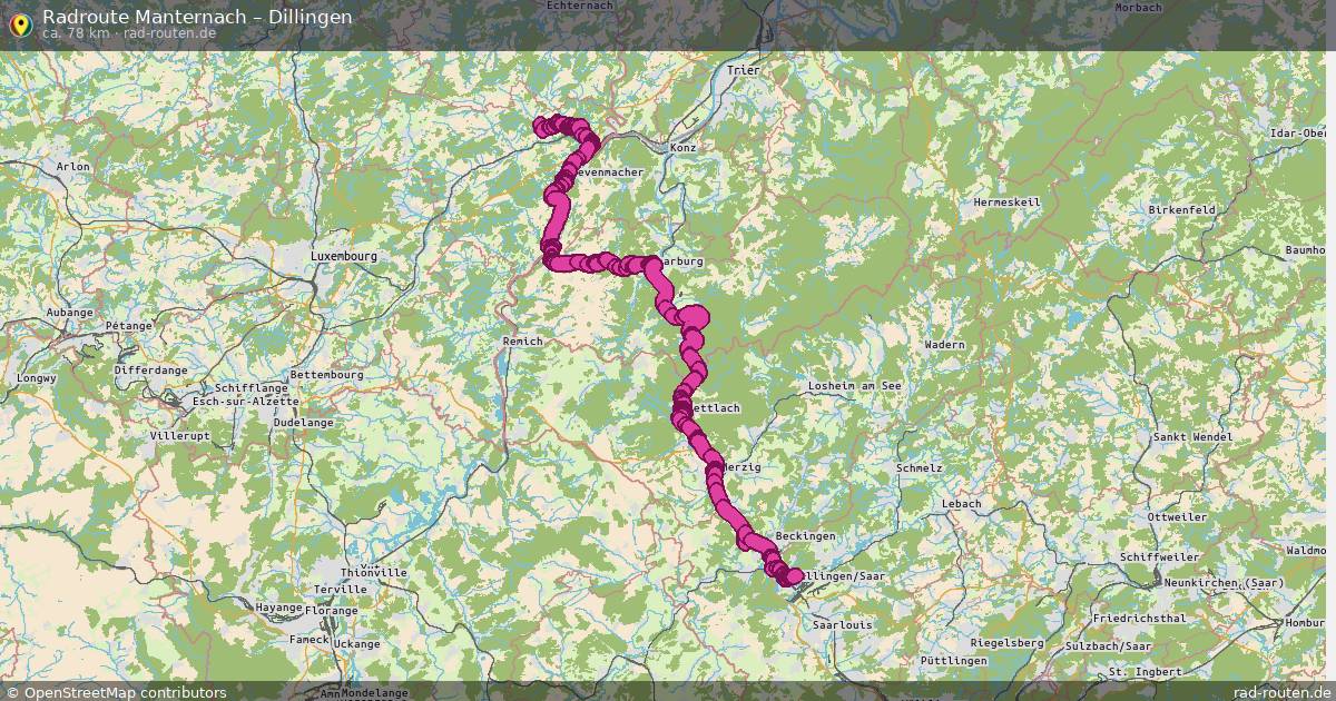 Die Fahrradroute von Manternach nach Dillingen ist ca. 78 km lang und führt über Condominium Lëtzebuerg-Deutschland, Wellen, Rehlingen und Wincheringen. Wichtige Straße auf der Strecke: Route des Menhirs.
