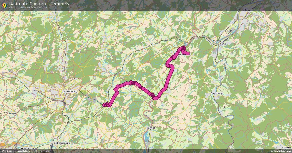 Die Fahrradroute von Contern nach Temmels ist ca. 36 km lang und führt über Condominium Lëtzebuerg-Deutschland und Wellen.