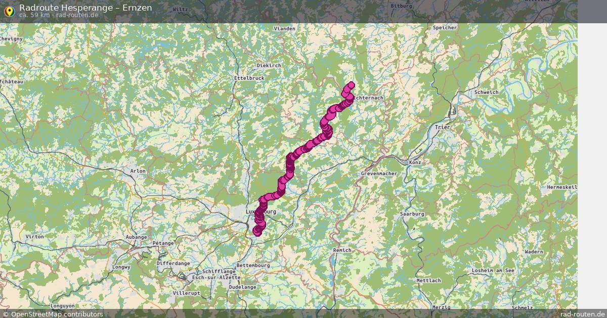 Die Fahrradroute von Hesperange nach Ernzen ist ca. 59 km lang und führt über Lëtzebuerg und Südeifel. Wichtige Straßen auf der Strecke: Rue de Sandweiler und Rue d'Itzig.