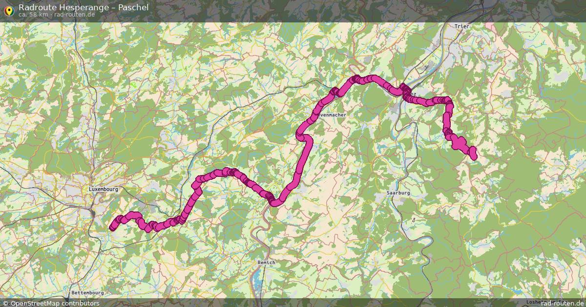 Die Fahrradroute von Hesperange nach Paschel ist ca. 58 km lang und führt über Wincheringen, Bilzingen, Körrig und Kahren. Wichtige Straßen auf der Strecke: Kiem und Gouschtengerwee.