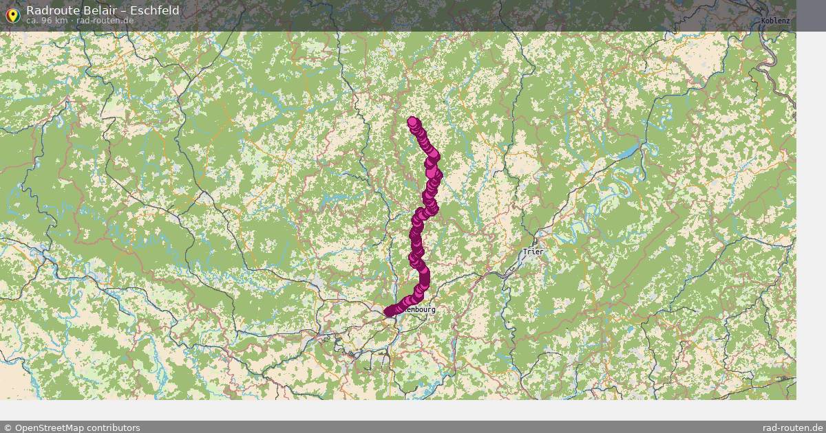 Die Fahrradroute von Belair nach Eschfeld ist ca. 96 km lang und führt über Hoscheid, Consthum, Hosingen und Munshausen. Wichtige Straßen auf der Strecke: Piste cyclable de l'Alzette, Fond Saint-Martin, Rue de la Gare und Dorfstraße.