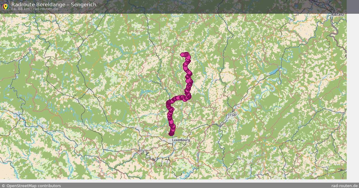 Die Fahrradroute von Bereldange nach Sengerich ist ca. 88 km lang und führt über Hosingen, Consthum, Munshausen und Heinerscheid. Wichtige Straßen auf der Strecke: Piste cyclable de l'Alzette und Rue de la Gare.