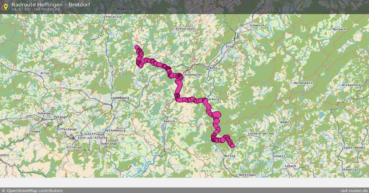 Die Fahrradroute von Heffingen nach Brotdorf ist ca. 87 km lang und führt über Condominium Lëtzebuerg-Deutschland, Wellen, Wincheringen und Wehr. Wichtige Straßen auf der Strecke: PC2, Klinkerstraße und Breinert.