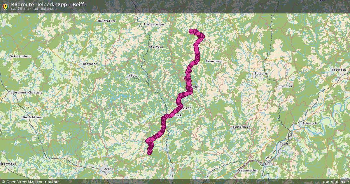 Die Fahrradroute von Helperknapp nach Reiff ist ca. 76 km lang und führt über Hoscheid, Consthum, Hosingen und Munshausen. Wichtige Straße auf der Strecke: Piste cyclable de l'Attert.