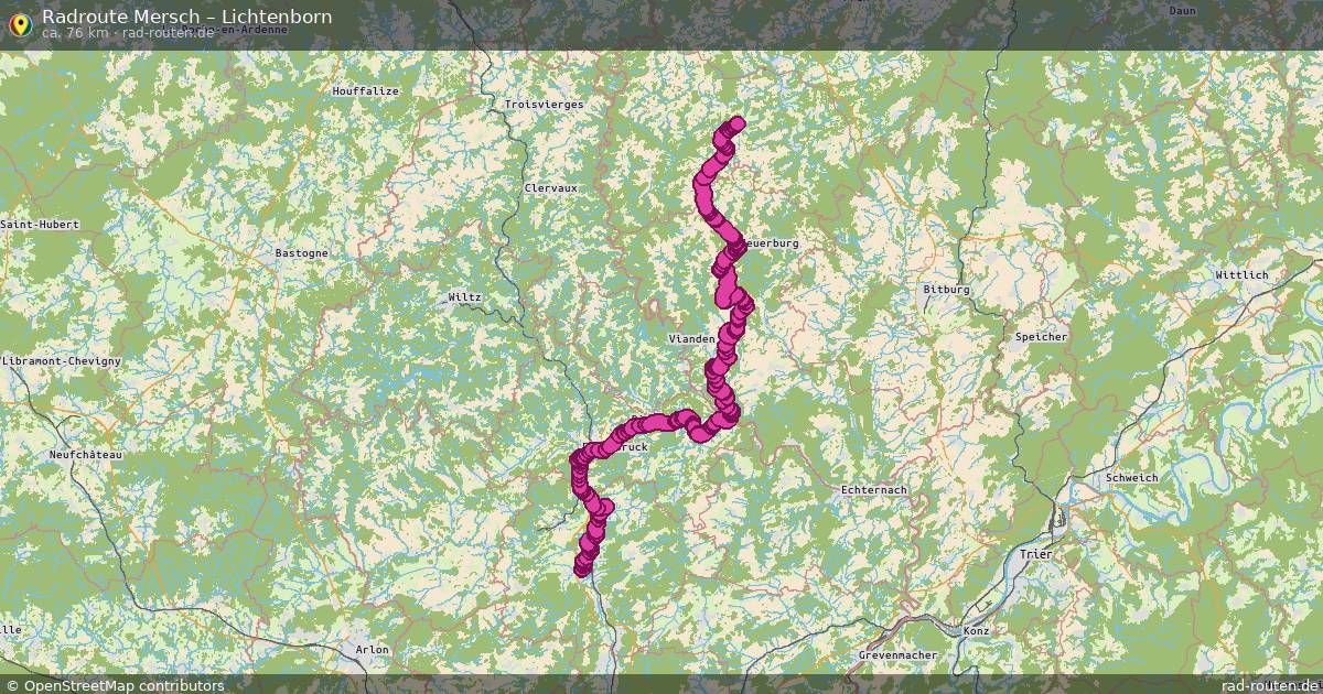 Die Fahrradroute von Mersch nach Lichtenborn ist ca. 76 km lang und führt über Südeifel und Arzfeld. Wichtige Straßen auf der Strecke: Piste cyclable de l'Alzette, Rue de la Gare und Am Roudebierg.