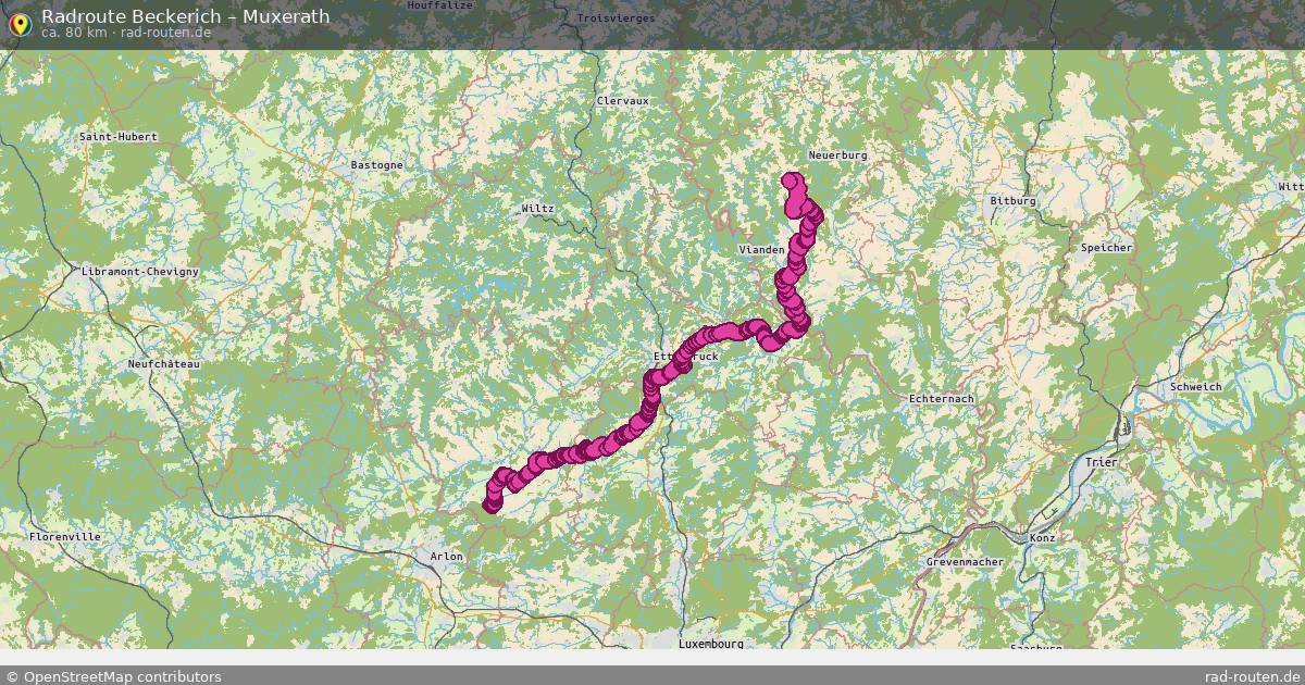 Die Fahrradroute von Beckerich nach Muxerath ist ca. 80 km lang und führt über Lëtzebuerg und Südeifel. Wichtige Straßen auf der Strecke: Piste cyclable de l'Attert und Am Roudebierg.