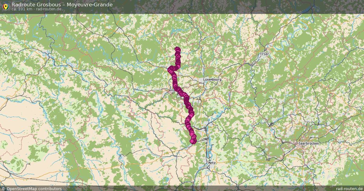 Die Fahrradroute von Grosbous nach Moyeuvre-Grande ist ca. 101 km lang und führt über Hobscheid und Autelbas. Wichtige Straßen auf der Strecke: Piste cyclable de l'Attert, Piste Cyclable Agglomération Thionville Porte de France und Piste cyclable de la Terre Rouge.