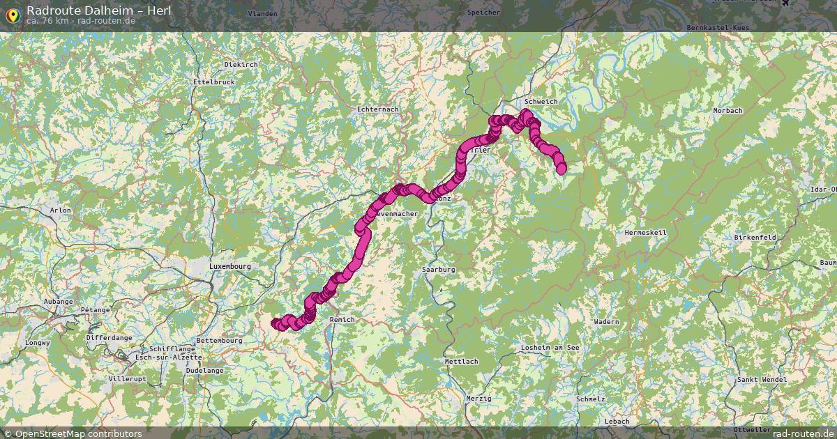 Die Fahrradroute von Dalheim nach Herl ist ca. 76 km lang und führt über Wincheringen, Wellen, Temmels und Oberbillig. Wichtige Straße auf der Strecke: Moselstraße.
